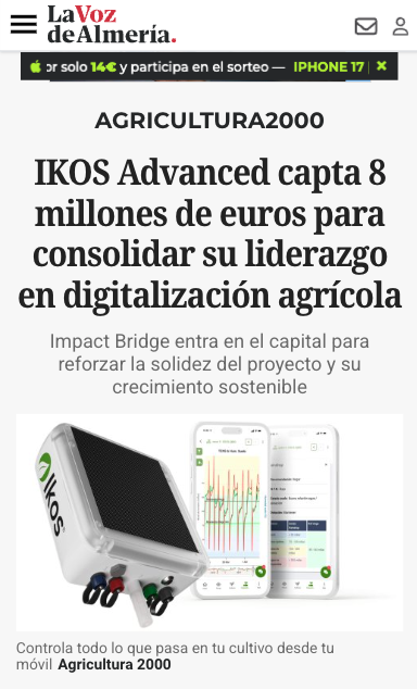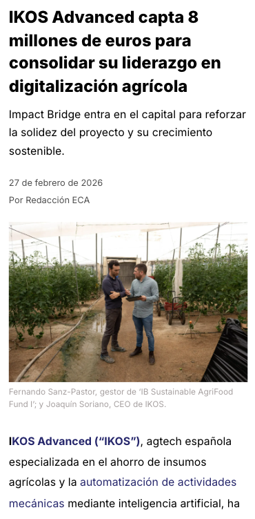 IKOS Advanced, especializada en la aplicación de IA en el campo, recibe una inversión de 8 millones de euros con la entrada de Impact Bridge…